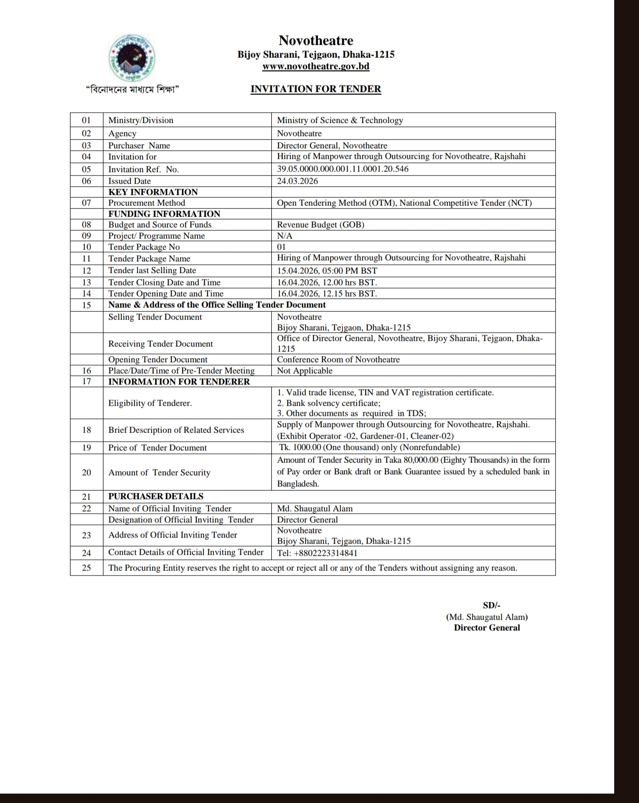 রাজশাহী নভোথিয়েটারের জন্য আউটসোর্সিংয়ের মাধ্যমে জনবল নিয়োগ