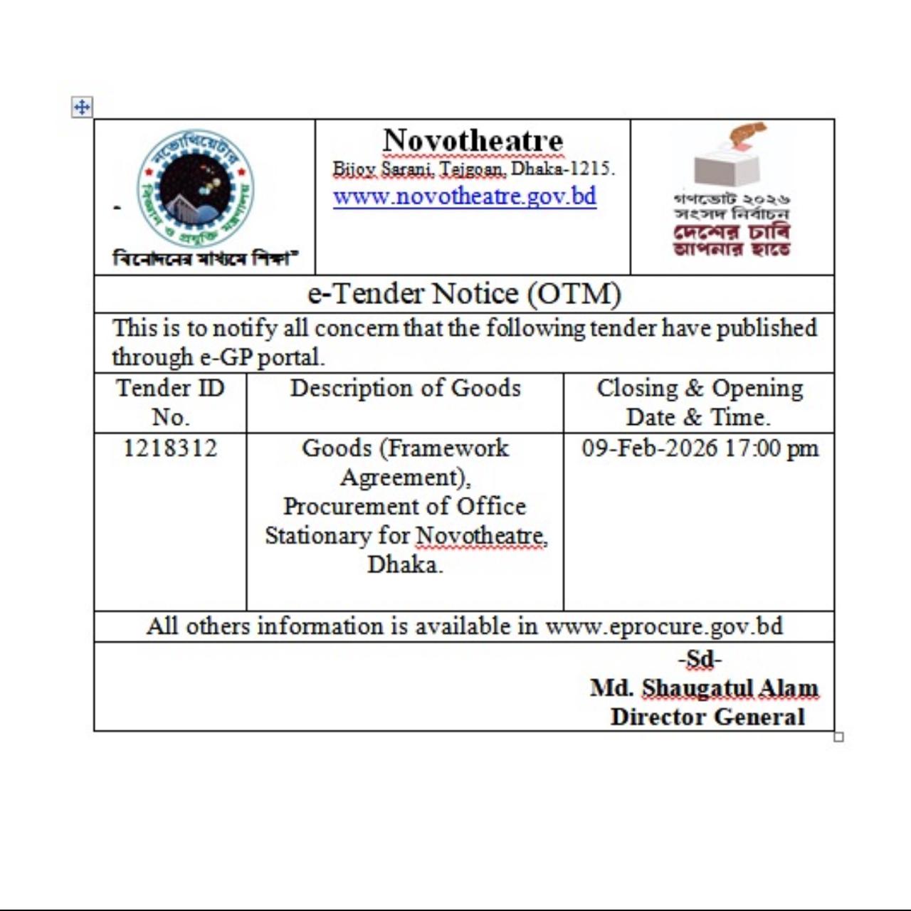 ১ পবিত্র রমজান উপলক্ষে নভোথিয়েটারের প্রদর্শনী সময়সূচী ১৭-০২-২০২৬ দেখুন ২ ই-টেন্ডার নোটিশ ২৮-০১-২০২৬ দেখুন ৩ 50 thing's to see with a small telescope ২০-০১-২০২৬ দেখুন ৪ ০৭ ডিসেম্বর, ২০২৫ থেকে ১২ ডিসেম্বর, ২০২৫ পর্যন্ত প্ল্যানেটেরিয়াম প্রদর্শনী বন্ধ থাকবে, কারণ এই সময়ে প্ল্যানেটেরিয়াম যন্ত্রপাতির বার্ষিক রক্ষণাবেক্ষণের কাজ চলবে; তবে, অন্যান্য প্রদর্শনী যেমন ৫ডি মুভি এবং ভি.আর ও প্রদর্শনী গ্যালারি যথারীতি খোলা থাকবে। ০৬-১২-২০২৫ দেখুন ৫ Invitation for Re-tender(Supply of manpower through outsourcing) ০৬-১১-২০২৫ দেখুন ৬ নভোথিয়েটারের কারিগরি বিশেষজ্ঞ কমিটির সভা ২২-১০-২০২৫ দেখুন ৭ নভোথিয়েটারের ১০ম-২০তম গ্রেডের কর্মচারী নিয়োগ/পদোন্নতি প্রদানের লক্ষ্যে গঠিত বাছাই কমিটির সুপারিশ অনুমোদন প্রসঙ্গে ২২-১০-২০২৫ দেখুন ৮ নভোথিয়েটারের পরিচালনা বোর্ডের ৪৭ তম সভার নোটিশ ০৭-১০-২০২৫ দেখুন ৯ নভোথিয়েটার রংপুর প্রকল্প প্রতিষ্ঠার জন্য আন্তর্জাতিক সময় ভিত্তিক পৃথক প্ল্যানেটারিয়াম পরামর্শদাতার SARFA নির্বাচনের জন্য আদর্শ অনুরোধ ৩০-০৯-২০২৫ দেখুন ১০ নভোথিয়েটার রংপুর প্রকল্প প্রতিষ্ঠার জন্য SARFA স্বতন্ত্র প্রদর্শনী পরামর্শদাতা আন্তর্জাতিক সময় ভিত্তিক নির্বাচনের জন্য আবেদনের জন্য আদর্শ অনুরোধ ৩০-০৯-২০২৫ দেখুন